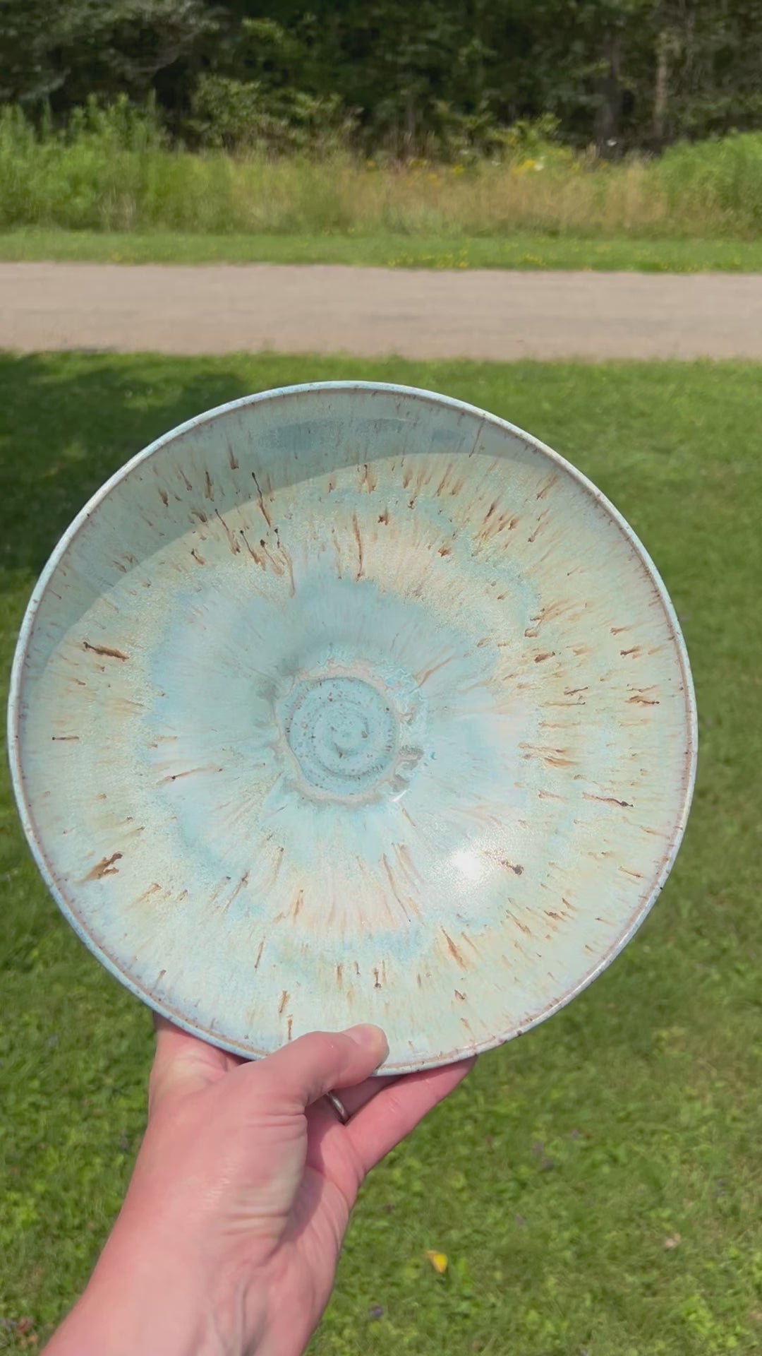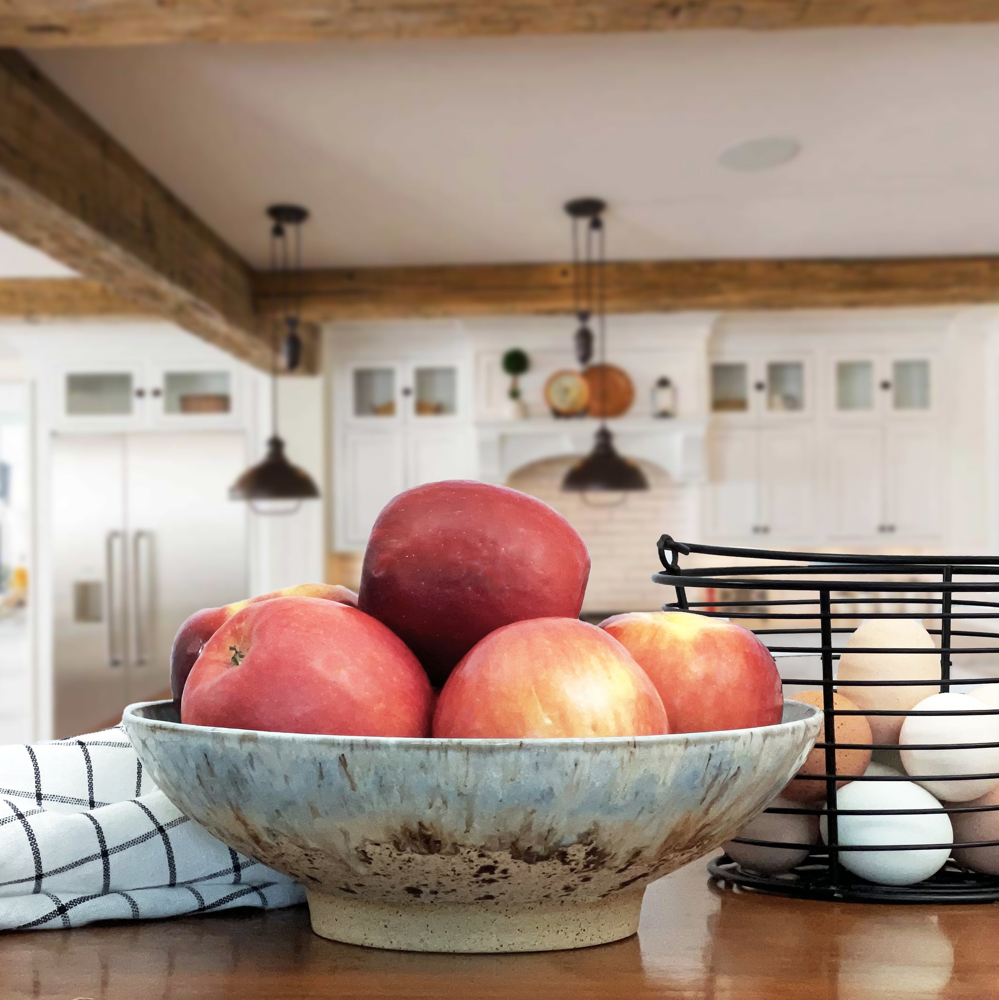 Get ready to serve up some serious style with this large bowl featuring a unique combination of blue and brown. Perfect for holding fruit or serving dishes, this bowl adds a touch of fun to any table. The speckled clay and blue glaze gives it a Beachy, coastal vibe — perfect for summer (or dreaming of it all year ‘round, right?).