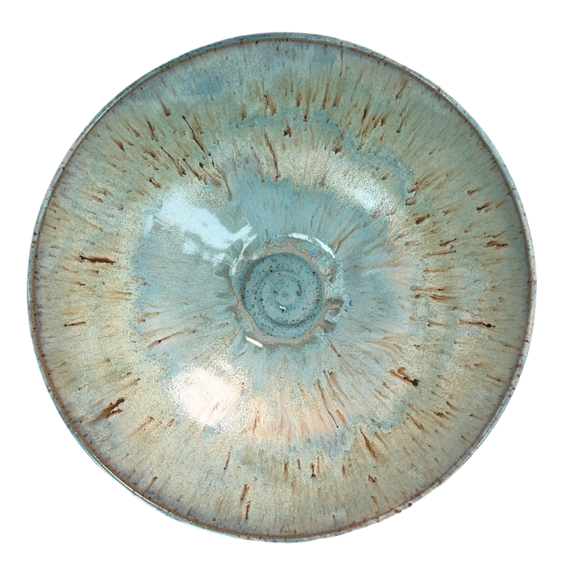 Blue and white glaze with brown accents on brown speckled clay.
