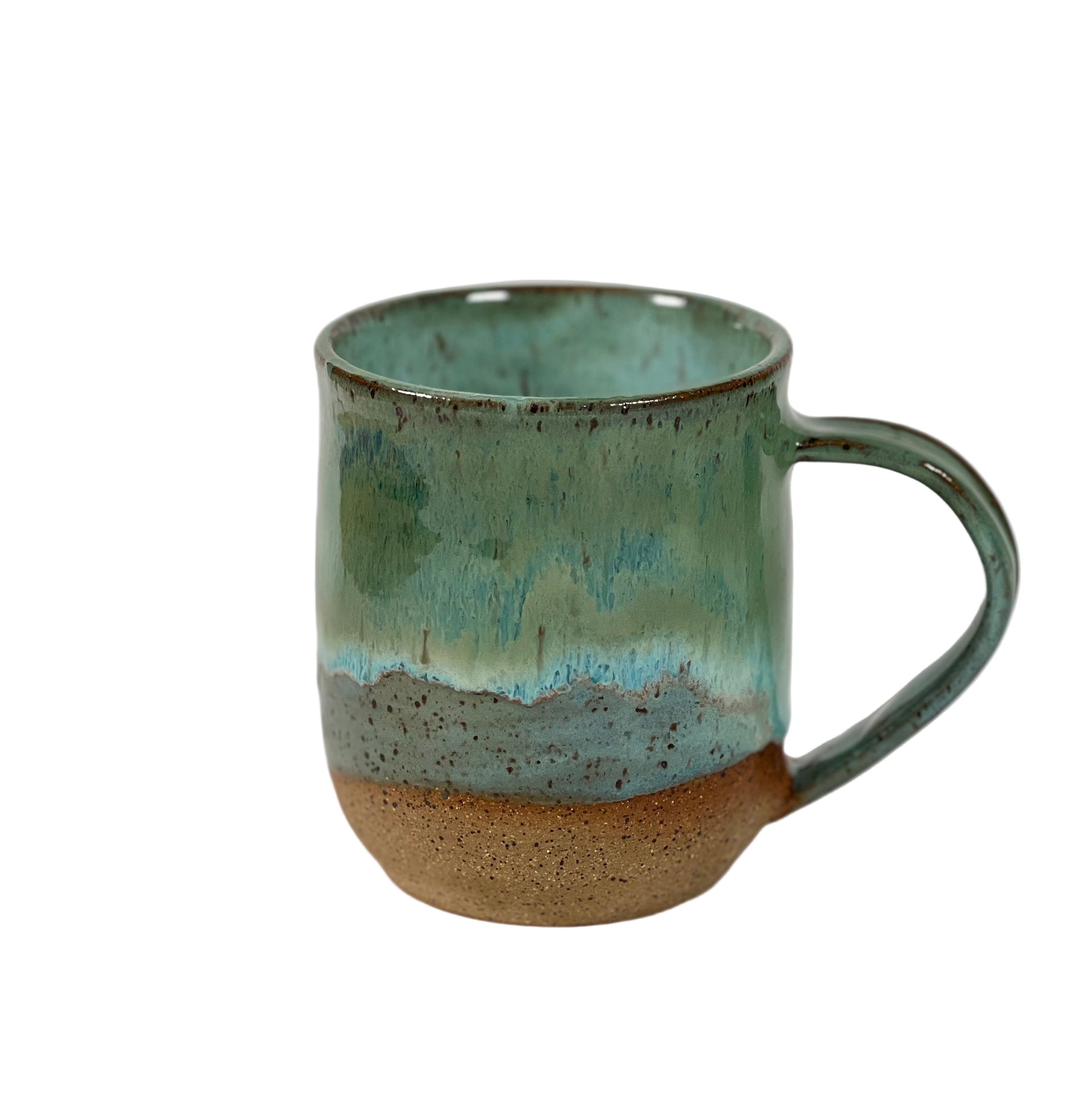 A calm, woodsy stoneware mug glazed in layered greens with a soft blue transition along the midline. The colors blend naturally and settle into the raw speckled clay at the base, giving it a clean, earthy look that fits the Cedarbrook name.