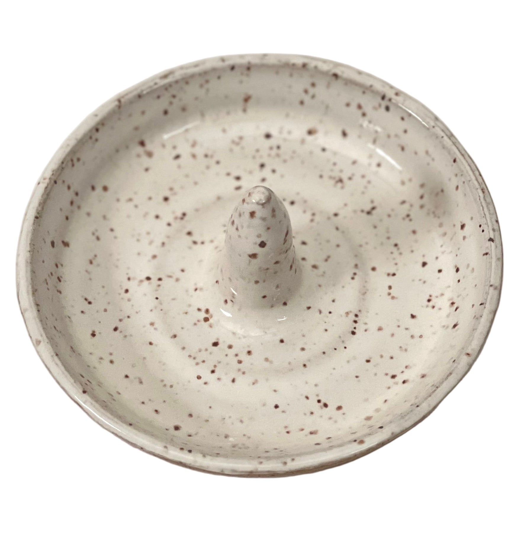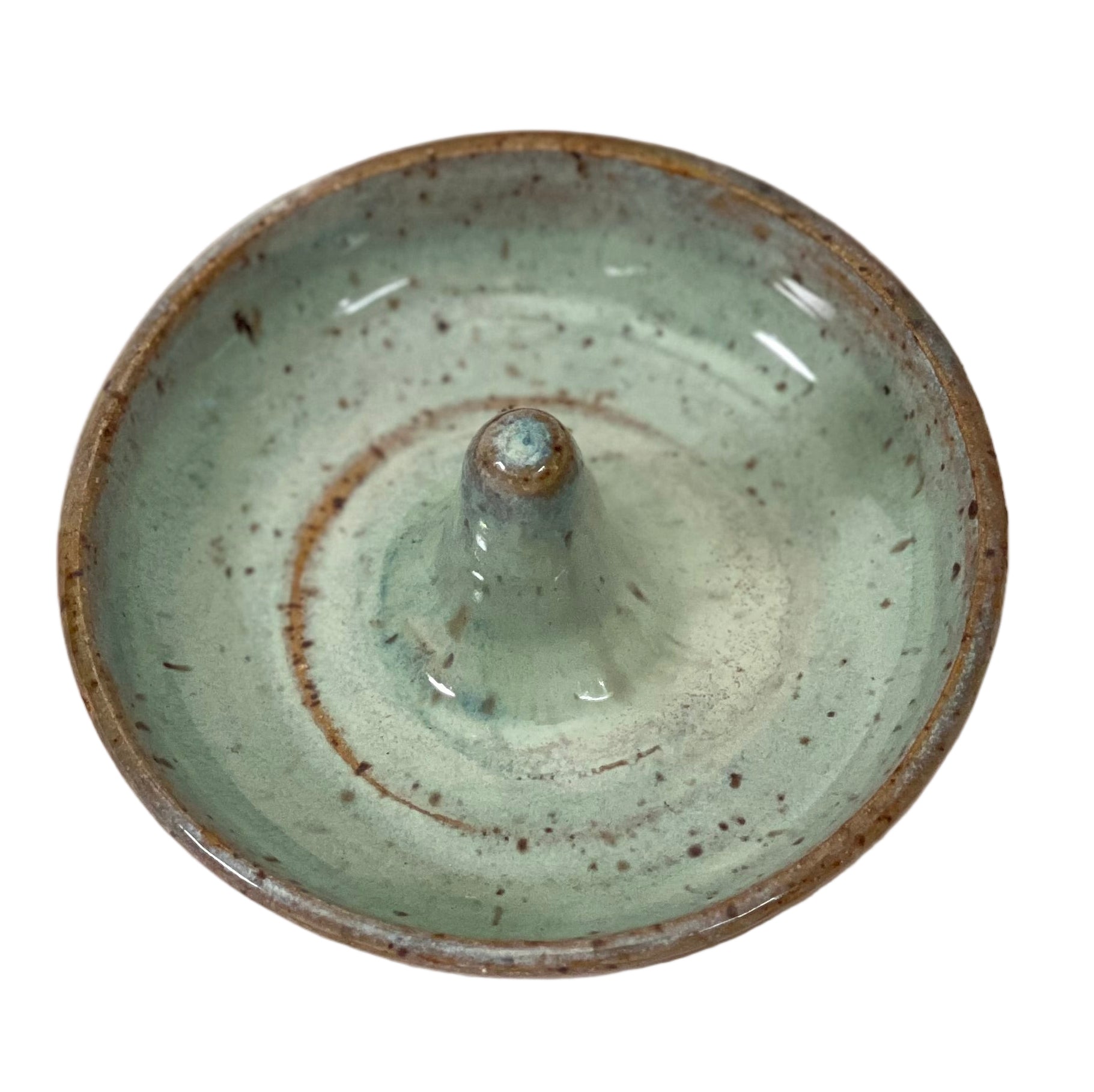 Keep your rings safe and easy to find with these small stoneware ring holders. Each one is wheel-thrown from speckled brown clay and finished in a variety of glaze colors. Perfect for placing beside the sink, on a nightstand, or by your jewelry tray.