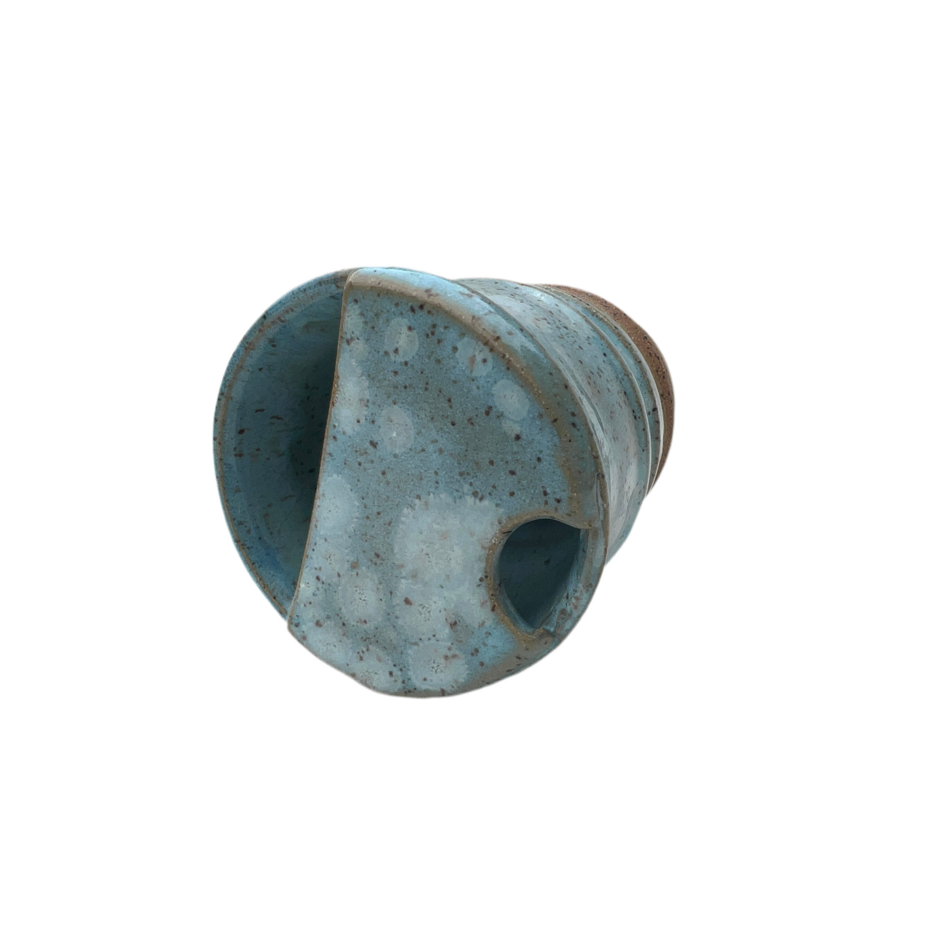 The Skybreak Travel Mug is a must-have for any on-the-go coffee lover. Handcrafted from durable brown speckled stoneware, this wheel thrown mug features a stunning blue glaze with white crystal accents, reminiscent of puffy clouds.